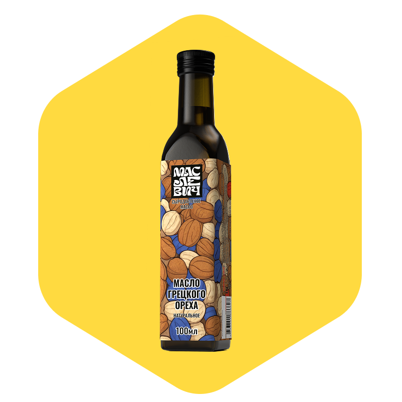 Масло грецкого ореха холодного отжима в стеклянной бутылке 100/250 мл Натуральное масло из грецкого ореха, полученное методом холодного отжима, сохраняет все ценные свойства сырья. Это кладезь Омега-3, витаминов E, B1, B6, магния и йода. Продукт обладает тонким ореховым ароматом и богатым вкусом.